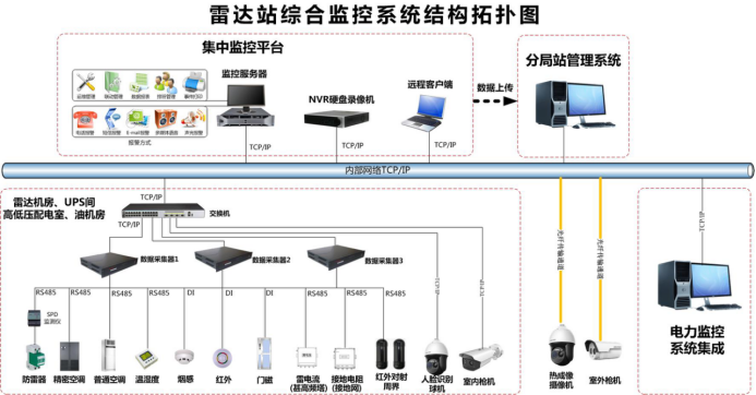 智能化綜合監(jiān)控系統(tǒng),能通過建設(shè)統(tǒng)一的監(jiān)控和管理平臺,通過數(shù)據(jù)采集和網(wǎng)絡(luò)傳輸?shù)姆绞?,將各雷達站內(nèi)各自獨立的動力環(huán)境設(shè)備、防雷設(shè)施的運行指標(biāo)、狀態(tài)、參數(shù)等數(shù)據(jù)集中存儲、查詢和監(jiān)控,對于異常數(shù)據(jù)進行多種方式報警,同時結(jié)合先進的視頻監(jiān)控技術(shù)對雷達站進行可視化監(jiān)控,實現(xiàn)數(shù)據(jù)圖形一體化監(jiān)控,從而縮短判斷故障的時限,提高解決故障的能力,達到實時記錄和監(jiān)控、有效預(yù)警和報警,一定程度上改變設(shè)備出現(xiàn)故障再進行維修的被動局面,做到預(yù)防在先,把隱患和故障消滅在萌芽中,實現(xiàn)對雷達站的綜合、安全和無人值守的高效管理的目的,系統(tǒng)具備較高的穩(wěn)定性、可靠性、安全性等特性,可在惡劣的環(huán)境下7*24*365天不間斷可靠運行。