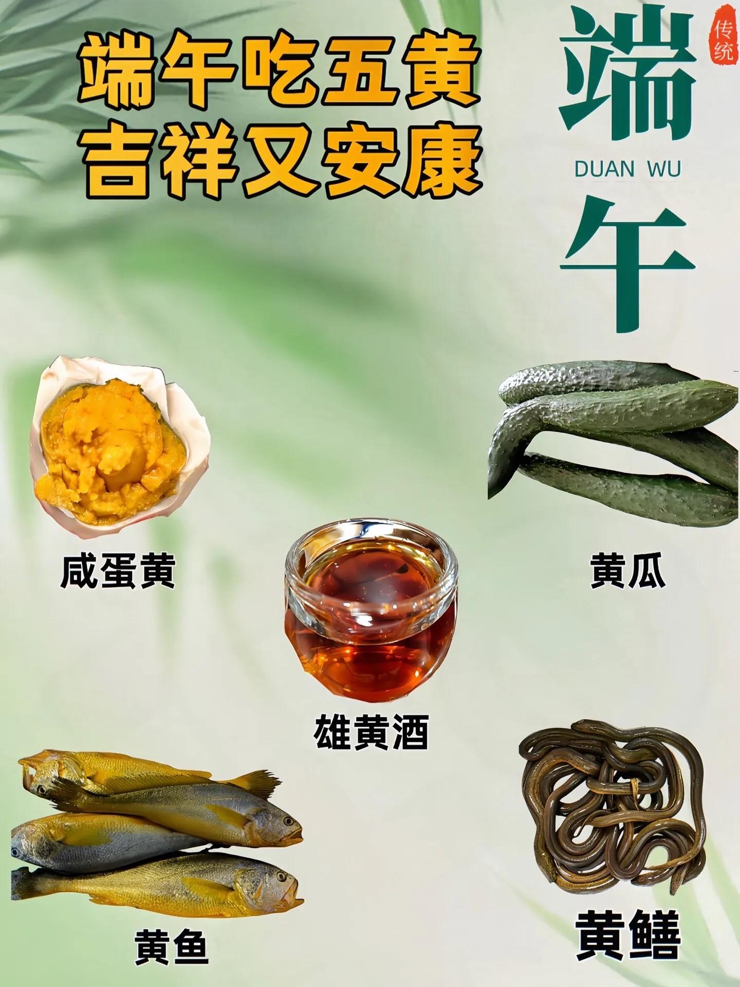 在端午節(jié),還有吃五黃的習(xí)俗,即黃魚(yú)、黃瓜、黃鱔、咸鴨蛋黃、雄黃酒。這些食物在端午時(shí)節(jié)食用,被認(rèn)為可以祛病防疫、增強(qiáng)體質(zhì)。