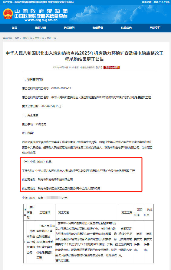 項(xiàng)目名稱:中華人民共和國拱北出入境邊防檢查站 2025年機(jī)房動(dòng)力環(huán)境擴(kuò)容及供電隱患整改工程;